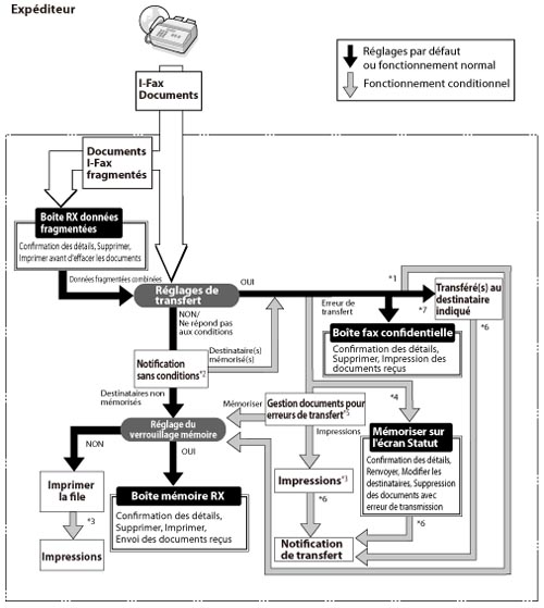 *1 Si [Stocker/impr. doc. reçu] est réglé sur "Oui" sous [Réglages de transfert], les documents transférés sont imprimés ou stockés dans la Boîte mémoire RX.