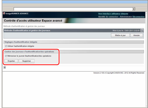 Décocher [Mémoriser le journal d'authentification/opérationnel] → cliquer sur [Mettre à jour].