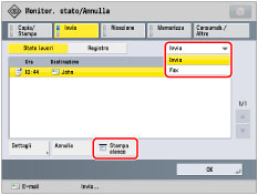 Sull'elenco dei lavori di invio viene stampata una lista delle trasmissioni fax, e-mail, I-fax e file server e mailbox.