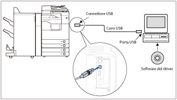 Non è possibile specificare un computer collegato alla macchina con un collegamento USB come destinazione dei lavori inviati o inoltrati. Inoltre con tale computer non è possibile utilizzare la IU remota e la funzione ScanGear di rete.