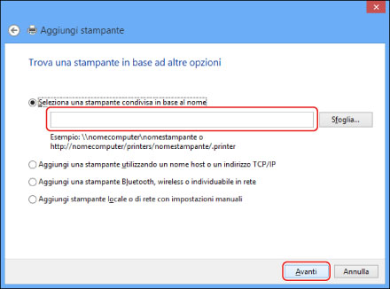 Windows 8/Server 2012: selezionare [La stampante desiderata non è nell'elenco] → [Seleziona una stampante condivisa in base al nome ].