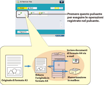 Per esempio, è possibile eseguire la scansione di un originale A3, ridurlo al formato A4 e inviarlo via e-mail, memorizzando anche un backup del file in una mailbox, tutto premendo un unico pulsante.