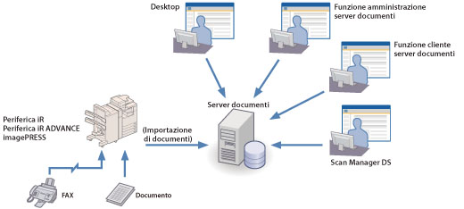 È possibile memorizzare documenti creati con Desktop, come pure documenti digitalizzati mediante macchine Canon e Document Scanner DR Series (scanner documenti) attraverso la rete, nonché creare un sistema avanzato di gestione dei documenti in grado di gestire in maniera efficiente i documenti memorizzati.