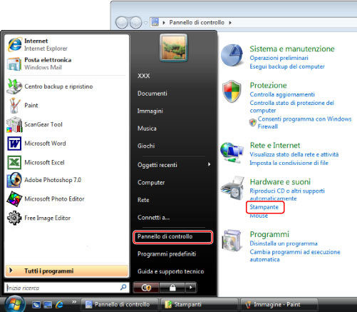 ] (Start) → selezionare [Pannello di controllo] → [Stampante].