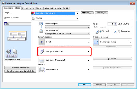 Confermare che [Stampa fronte/retro] sia selezionato per [Stile di stampa]. → fare clic su [OK].