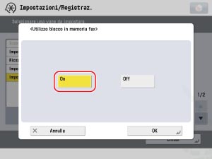 → [Impostazioni funzione] → [Ricezione/Inoltro] → [Impostazioni comuni] → [Impostazione mailbox fax/I-Fax] → [Utilizzo blocco in memoria fax].