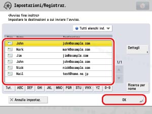 Premere [Avviso fine inoltro] → selezionare un indirizzo e-mail registrato → premere [OK].