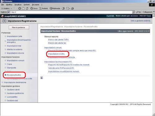 Accedere alla IU remota → fare clic su [Impostazioni/Registrazione] → [Ricezione/Inoltro] → [Impostazioni inoltro].