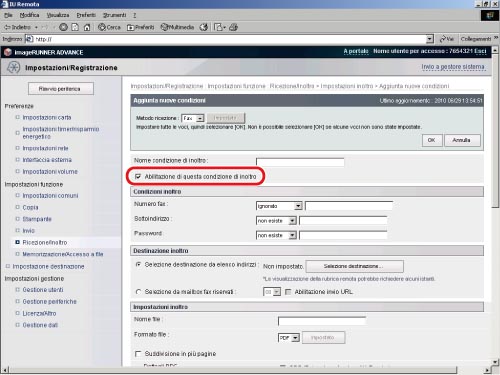 [Abilitazione di questa condizione di inoltro] equivale al pulsante [Convalida/Annulla] nella schermata delle impostazioni di inoltro nella imageRUNNER ADVANCE.