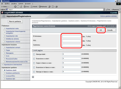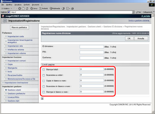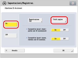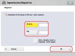 Specificare ID divisione e PIN → premere [Attiv./disattiv.limiti e impostaz. limiti pagine].