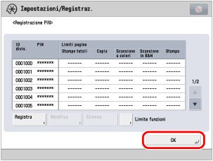 Premere [Conferma] → immettere lo stesso numero per confermare il PIN → premere [OK].