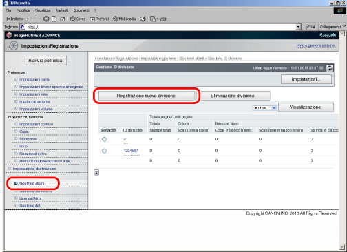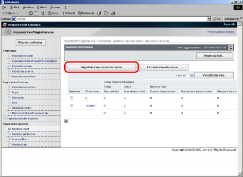 Accedere alla IU remota → fare clic su [Impostazioni/Registrazione] → [Gestione utenti] → [Gestione ID divisione] → [Registrazione nuova divisione].