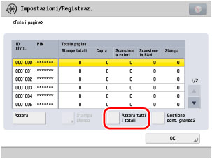 Se si desidera registrare i conteggi di ogni mese, premere [Azzera tutti i totali] su un giorno specifico di ogni mese. Non dimenticare di registrare i conteggi del mese precedente prima di premere il pulsante di azzeramento dei totali. Il contatore non può essere arrestato.