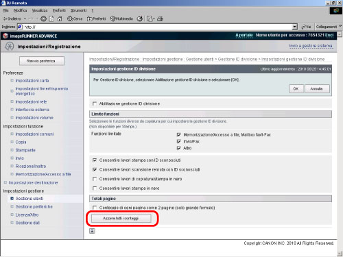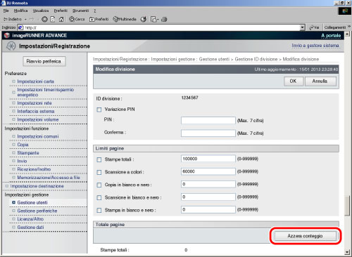 Per azzerare i conteggi di tutte le divisioni, fare clic su [Impostazioni...] nella schermata di Gestione ID divisione → fare clic su [Azzera tutti i conteggi].