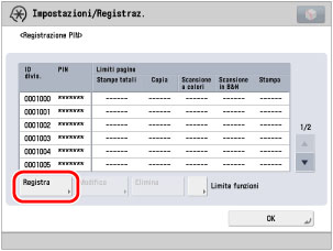 Non è possibile registrare un ID di divisione o un PIN costituiti esclusivamente dal numero zero, ad esempio <0> o <00>. Se si imposta un numero che inizia con degli zeri, gli zeri iniziali vengono ignorati. Esempio: se si immette <02> o <002>, viene registrato <0000002>.