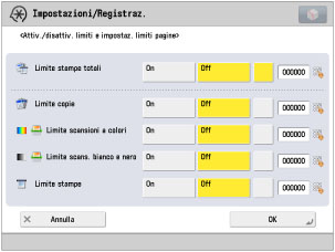 Se il numero raggiunge il limite, la funzione per la quale è stato raggiunto il limite non potrà essere utilizzata a meno che il modo Limiti pagine non venga disabilitato o che l'impostazione non venga modificata.