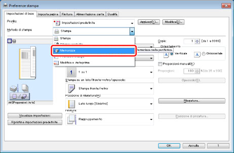 Fare clic sulla voce [File] del software applicativo utilizzato per la stampa del documento → selezionare [Stampa] per visualizzare la finestra di dialogo [Stampa] → fare clic su [Proprietà].