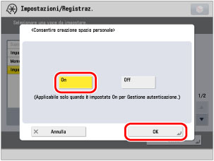 → [Impostazioni funzione] → [Memorizzazione/Accesso a file] → [Impostazioni Area di condivisione] → [Consentire creazione spazio personale].