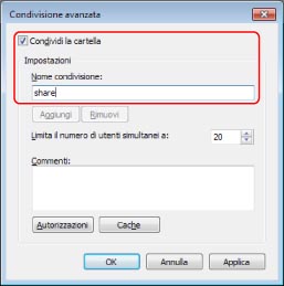 Per Windows XP, fare clic con il pulsante destro del mouse sulla cartella condivisa → selezionare [Proprietà] → fare clic sulla scheda [Condivisione] → fare clic su [Condividi la cartella] → digitare [Nome condivisione]. Per Windows Vista/Windows 7/Windows 8, fare clic con il pulsante destro del mouse sulla cartella condivisa → selezionare [Proprietà] → [Condivisione] → [Condivisione avanzata] → [Condividi la cartella] → digitare [Nome condivisione].