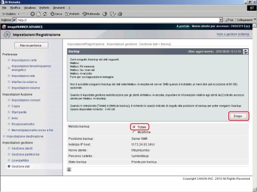 Selezionare [Totale] per il metodo di backup → fare clic su [Esegui].