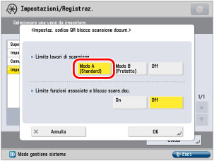 Specifica delle impostazioni operative di blocco scansione documento (codice QR)