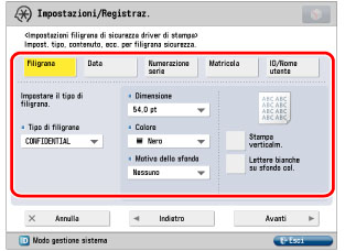 È possibile applicare misure di protezione, come Blocco scansione documento o Filigrana di sicurezza per prevenire copie non autorizzate e la perdita delle informazioni. Questi modi possono essere impostati dall'amministratore in modo da essere sempre riportati sulla stampa da parte di utenti generici.