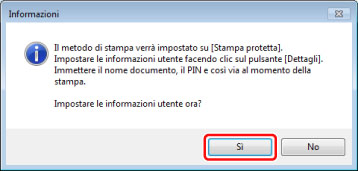 Fare clic su [Sì] nella finestra di dialogo per impostare le informazioni utente per il modo Stampa protetta.