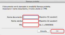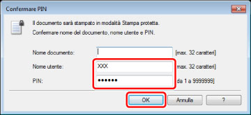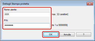 Immettere il nome documento, il nome utente e il PIN nella finestra di dialogo [Stampa protetta] → fare clic su [OK].