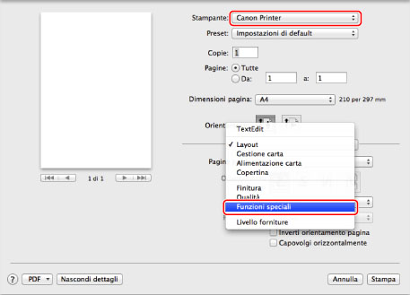 Selezionare la stampante da utilizzare → selezionare [Funzioni speciali].