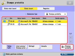 Sul lato sinistro del numero del lavoro di stampa viene visualizzata un'icona di blocco che indica il lavoro di stampa protetto.