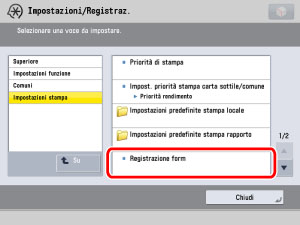 → [Impostazioni funzione] → [Comuni] → [Impostazioni stampa] → [Registrazione form].