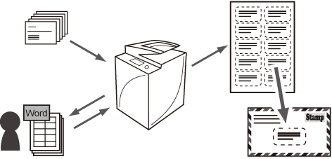 Mediante la funzione OCR (Testo ricercabile), è possibile trasformare i biglietti da visita scansionati in PDF o XPS con testo ricercabile. Il modo PDF o XPS ricercabile è utile in varie situazioni. In questa sezione viene spiegato come creare etichette di indirizzi mediante la funzione [Stampa unione] di Microsoft Word 2003.