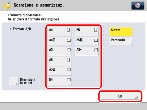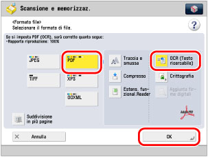 Selezionare [PDF] → [OCR (Testo ricercabile)] →premere [OK].