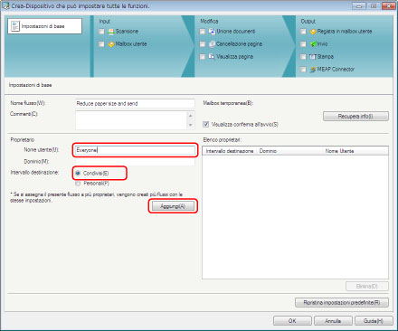 Immettere 'Tutti' per [Nome utente] → selezionare [Condivisi] per [Intervallo destinazione] → fare clic su [Aggiungi].