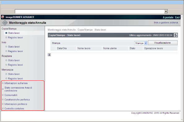 L'IU (Interfaccia Utente) remota può essere utilizzata per controllare lo stato della macchina, ad esempio per verificare la quantità di carta disponibile nelle varie fonti di alimentazione carta e per verificare se sono stati riscontrati errori. È anche possibile ottenere informazioni sul gestore del sistema, sulla posizione di installazione e sulle impostazioni di protocollo della macchina.