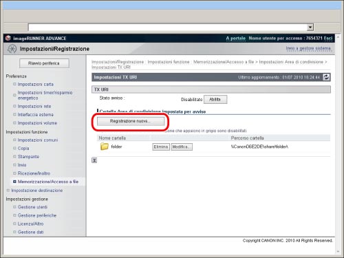 La notifica viene inviata ogni volta che un file viene salvato nella cartella specificata all'interno dell'area di condivisione da un indirizzo di loopback (un indirizzo che indica la stessa periferica di rete) mediante la funzione di invio o inoltro. Tuttavia, la notifica non verrà inviata nel caso in cui un file o una cartella si trovi in una sottocartella. Specificare un indirizzo di loopback quando si utilizza l'area di condivisione della macchina come destinazione per [Scansione e invio] o [Impostazioni inoltro]. (Vedere "Registrazione di un indirizzo dell'Area di condivisione".)