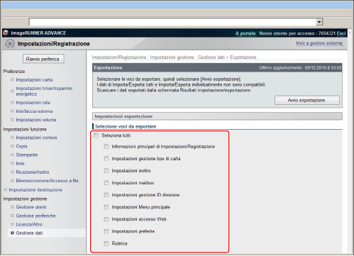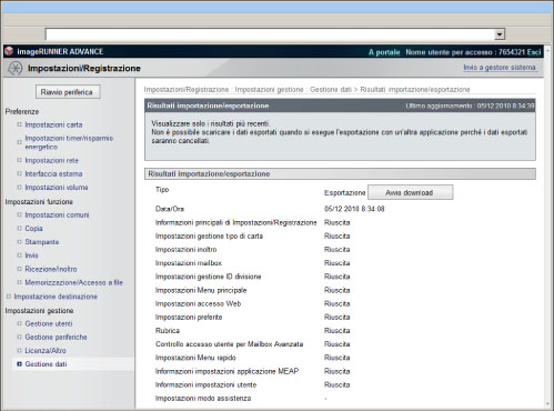 È inoltre possibile controllare gli ultimi risultati di importazione/esportazione premendo [Gestione dati] per <Impostazioni gestione> → [Risultati importazione/esportazione].
