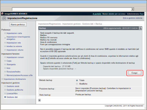 Per eseguire il backup/ripristino dei dati memorizzati, è necessario eseguire l'accesso come amministratore.