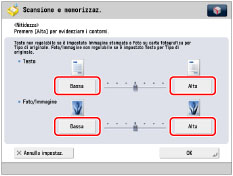 Per acquisire testo o linee in modo chiaro, l'impostazione deve essere verso [Alta]. Per acquisire originali contenenti fotografie stampate o altri mezzitoni, l'impostazione deve essere verso [Bassa].