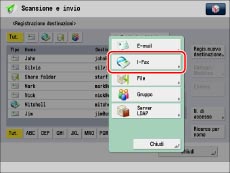 Il primo carattere immesso per il nome viene utilizzato per ordinare l'elenco delle destinazioni quando si premono i tasti [ABC], [DEF] e [GHI] nella schermata Rubrica. Selezionando [Ricerca per nome] nella schermata della Rubrica, viene visualizzata una schermata per restringere la ricerca nella Rubrica.
