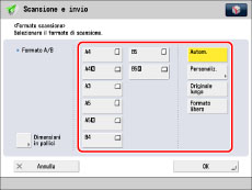 È possibile specificare manualmente un formato di scansione quando si acquisiscono originali che non possono essere rilevati con [Formato autom.]. Inoltre, è possibile memorizzare il formato di scansione specificato.