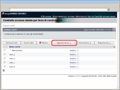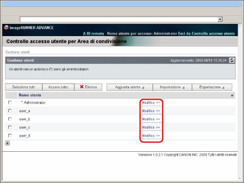 Solo l'amministratore dell'Area di condivisione può registrare/modificare le informazioni relative all'utente nella pagina [Gestione utenti] di [Controllo accesso utente per Area di condivisione]. Gli utenti generici possono modificare solo la propria password. (Vedere "Modifica delle informazioni relative all'utente da parte di utenti generici".)