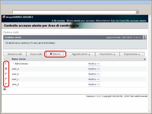 Viene visualizzato un asterisco (*) a sinistra della casella di controllo nella pagina [Gestione utenti] per gli amministratori registrati dell'Area di condivisione.