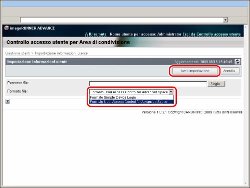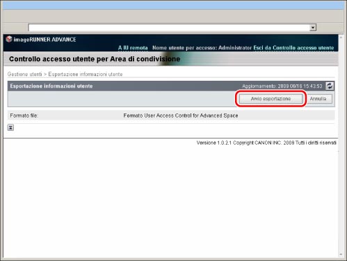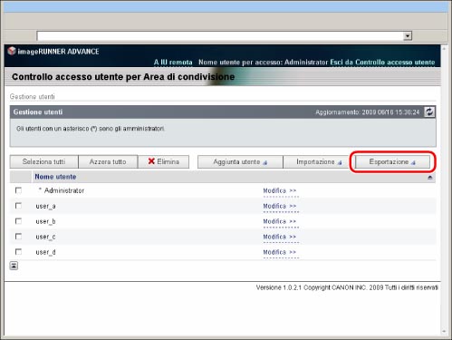 Per utilizzare un'altra macchina della serie imageRUNNER ADVANCE, esportare le informazioni relative all'utente quando si esegue il backup dei dati dell'Area di condivisione. Se si importano le informazioni relative all'utente nell'altra macchina, è possibile utilizzare i dati memorizzati nell'Area di condivisione. Per informazioni sul backup/ripristino dei dati memorizzati, vedere "Backup dei dati memorizzati".