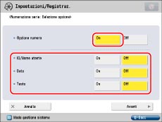 Selezionare [Impostazioni opzioni numerazione serie] → [On] per <Opzione numero> → specificare ogni impostazione.