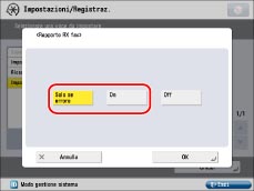 Il Rapporto RX fax consente di controllare se i documenti sono stati inviati correttamente dalla macchina del mittente e ricevuti correttamente dalla macchina del destinatario. Il Rapporto RX fax può essere stampato automaticamente una volta ricevuti i documenti ed è inoltre possibile impostare la macchina in modo che stampi un Rapporto RX fax solo quando si verifica un errore di ricezione.