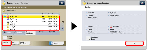 Wählen Sie die gewünschte Datei → Berühren Sie nacheinander die Dateien [Details] → [OK].
