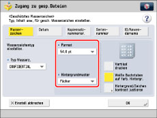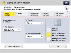 Text, den Sie unter [Anwenderdefin.] eingeben, wird nicht automatisch gespeichert. Wenn Sie das neu erzeugte geschützte Wasserzeichen speichern möchten, um es aufzurufen, wenn Sie es benötigen, berühren Sie die Taste [Speichern] → Geben Sie den zu speichernden Text ein.