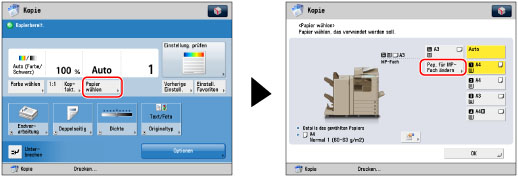 Berühren Sie nacheinander die Tasten [Papier wählen] → [Pap. für MP-Fach ändern].