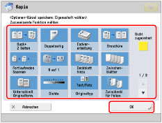 Sie können Kürzel für häufig verwendete Funktionen in [Optionen] erstellen. Diese Kürzel werden auf dem Grundfunktionendisplay für Expresskopien angezeigt.